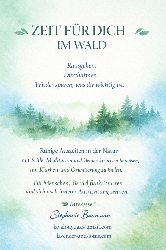 Wir gehen gemeinsam langsam durch den Wald, kommen zur Ruhe, lassen Gedanken sich sortieren und öffnen einen Raum für das, was gerade wichtig ist – ohne Druck, ohne Zielvorgabe.